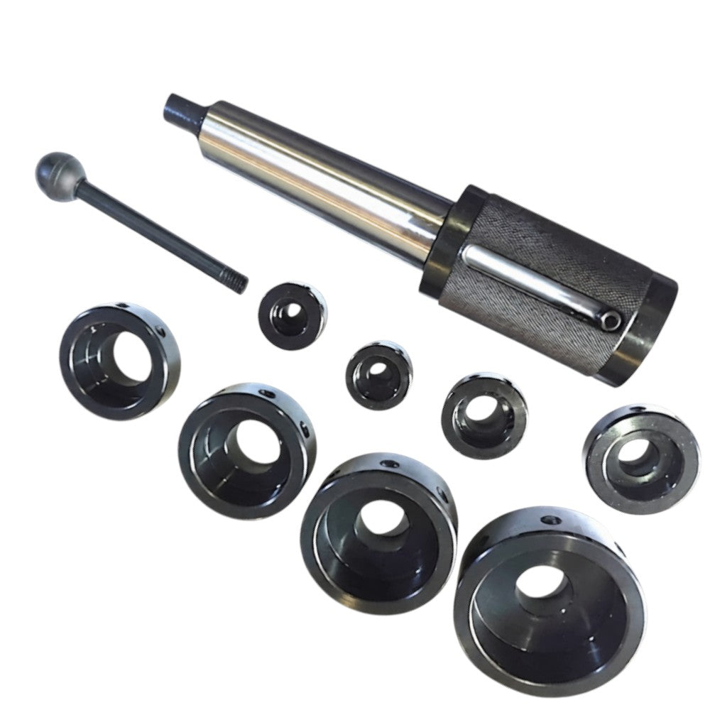 The holder features a Morse Taper 5 (MT5) shank that fits securely into the lathe tailstock, ensuring concentric alignment with the workpiece. Button dies are mounted in interchangeable die holders, which fit into the front of a knurled sliding sleeve. The sleeve moves freely on a fixed arbor, allowing the die to follow the thread naturally for clean, accurate results with reduced risk of cross-threading.
